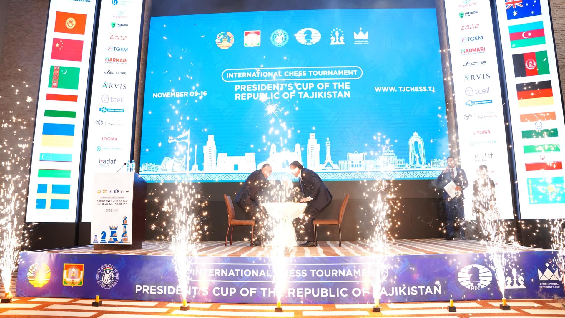 10 ноября 2025 года в гостинице Hyatt Regency Dushanbe состоялась торжественная церемония официального открытия Международного турнира по шахматам на Кубок Президента Республики Таджикистан.Мероприятие проводится в рамках спортивно-ориентированной политикиОснователя мира и национального единства - Лидера нации, Президента Республики Таджикистан Эмомали Рахмона, и реализуется в соответствии с календарём Международной шахматной федерации (FIDE) и Единым календарным планом физкультурно-спортивных мероприятий Республики Таджикистан на 2025 год.В турнире принимают участие более 230 шахматистов из 16 стран мира.Турнир пройдет в Душанбе с 9 по 16 ноября 2025 года.Соревнование приурочено Дню Президента Республики Таджикистан и направлено на:- развитие шахмат в стране;- укрепление международного сотрудничества;- популяризацию здорового образа жизни среди молодежи.Организаторами являются комитет по делам молодежи и спорта при Правительстве Республики Таджикистан, а также Федерация шахмат Таджикистана.В официальной части приняли участие:- Рахмонзода Абдулло Курбонали — Помощник Президента РТ по вопросам социального развития и связей с обществом- Гулахмадзода Зулфикор Ахмад — Председатель Комитета по делам молодежи и спорта- Зафар Мирзо — Председатель Национальной Федерации Шахмат/Председатель Совета Директоров Группы Компаний "КОИНОТИ НАВ"- Одилзода Дилбар Рахим - Заместитель Председателя г. ДушанбеСпикеры подчеркнули вклад Лидера нации в развитие спорта и отметили, что проведение крупных турниров способствует росту профессионального уровня таджикских спортсменов и укреплению международного имиджа Таджикистана.Турнир объединяет шахматистов разного уровня и формирует новую динамику развития этого вида спорта в стране, создавая платформу для ярких спортивных достижений и обмена опытом.